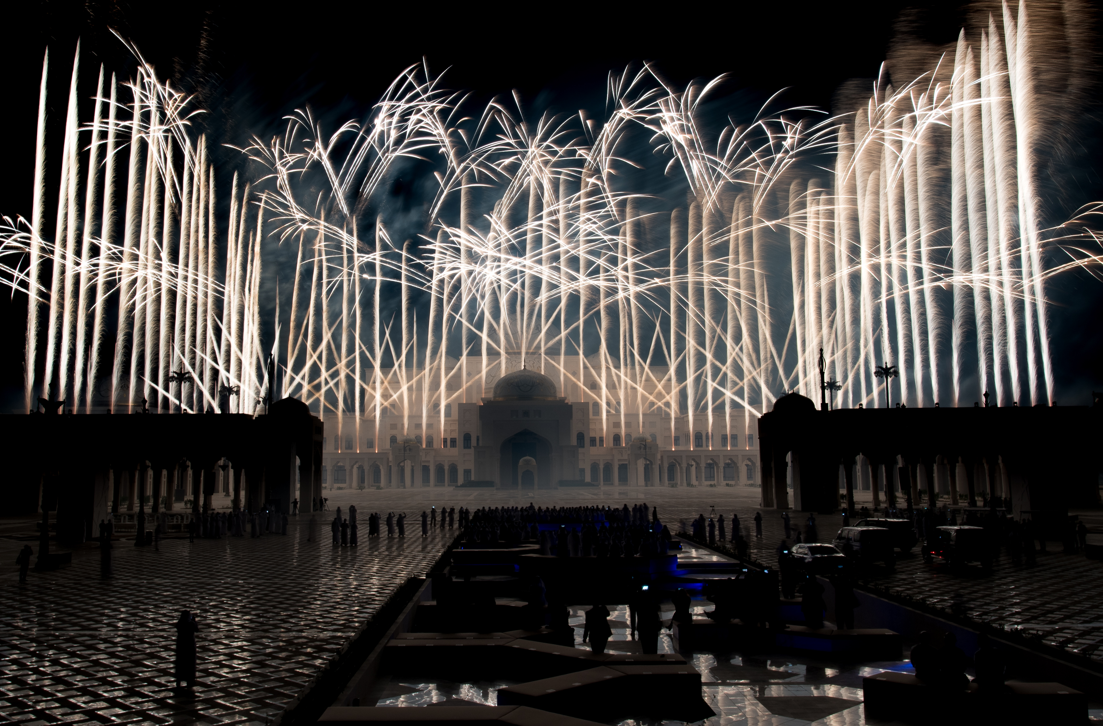 „Seine Hoheit Shaikh Mohammad Bin Rashid Al Maktoum, Vizepräsident und Premierminister der Vereinigten Arabischen Emirate und Herrscher von Dubai, und seine Hoheit Shaikh Mohammad Bin Zayed Al Nahyan, Kronprinz von Abu Dhabi und stellvertretender Oberbefehlshaber der Streitkräfte der Vereinigten Arabischen Emirate, weihten Qasr Al Watan im Präsidentenpalast in Abu Dhabi ein. FLASH ART wurde die Ehre zuteil, für diesen historischen Anlass ein Feuerwerk zu inszenieren.“