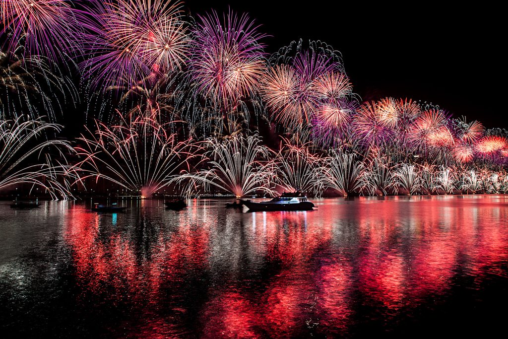 „Zum Jahreswechsel inszenierte FLASH ART Dubai ein 10minütiges extravagantes Feuerwerk, das den Emirates Palast, die Etihad Towers und die Skyline von Abu Dhabi erleuchtete.