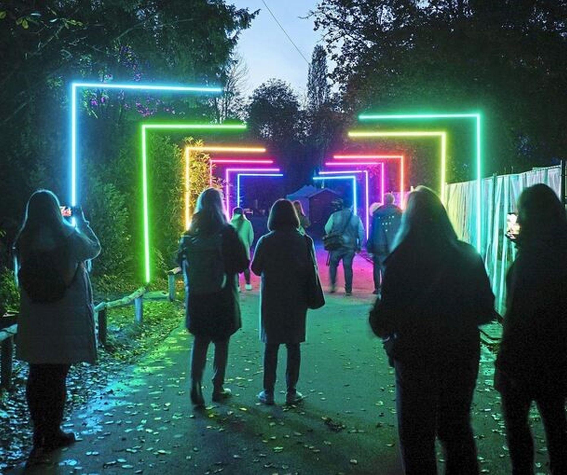 Der Einbahnweg führt in den Unteren Ostgarten und dort entlang des bewaldeten Hangs. Hier sind zahlreiche kleine Laternen platziert, eine Soundcollage mit Geraschel und Gewisper, Gezwitscher und Quaken untermalt die Illumination akustisch. „Hier wohnen Wichtel und Elfen“, ist ein Mädchen überzeugt und niemand möchte widersprechen.